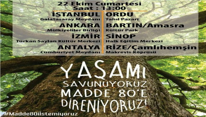 Kent, doğa ve hayvan hakları örgütleri İstanbul, Antalya, Bartın, Sinop, Ankara, Ordu ve İzmir’de Madde 80’in iptal edilmesi için eş zamanlı olarak sokağa çıkıyor
