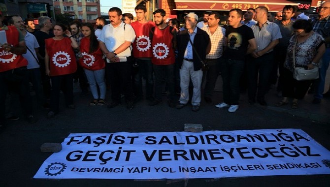 “Faşist saldırganlığa geçit vermeyeceğiz!” pankartını açan kitle, sık sık “Faşizme karşı omuz omuza”, “Yaşasın İşçilerin birliği, halkların kardeşliği” ve “Katillerden hesabı emekçiler soracak” sloganları attı.