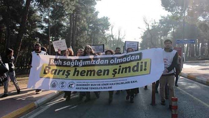 Sağlık emekçileri, bugün “Ruh sağlığımızdan olmadan, Barış hemen şimdi” çağrısıyla 12.30 da Bakırköy Ruh ve Sinir Hastalıkları Hastanesi’nde bir yürüyüş gerçekleştirdi.