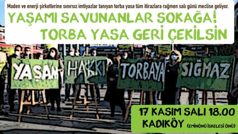Yasa tasarısının görüşüleceği Salı günü, TBMM’ye yasa tasarısının geri çekilmesi için yine yaşam savunucuları tarafından eylem yapılacak.17 Kasım Salı saat 18.00’de Kadıköy (Eminönü iskelesi )’de yapılacak eylem için çağrı yapıldı.